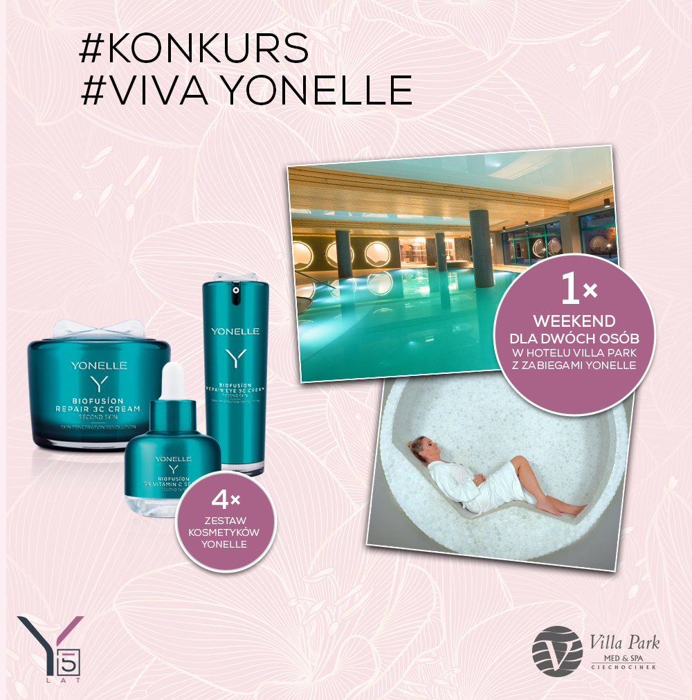 Ruszył czwarty już konkurs „VIVA YONELLE” z okazji 5-tych urodzin YONELLE. Jego partnerem jest Hotel Villa Park Med&Spa. Do wygrania – Nagroda główna, weekend dla dwóch osób w Hotelu Hotelu Villa Park Med&Spa z zabiegami YONELLE oraz zestawy kosmetyków YONELLE. Zapraszamy na nasz profil Facebook.