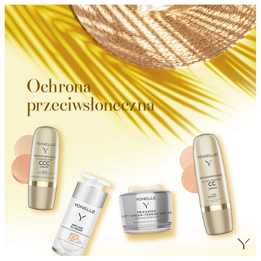 Wśród wszechstronnych formuł warto wspomnieć o kremie Yonelle Metamorphosis Hydroaktywny CCC Krem SPF 50. Przeznaczony do każdego rodzaju cery daje natychmiastowy efekt matujący (koniec z błyszczącym nosem!), wyrównuje koloryt, wygładza i – co ważne – nawilża, „pompując” wilgoć do skóry. Dzięki dodatkowi pigmentów koloryzujących tuszuje rozszerzone pory i zmarszczki, a cera wygląda po nim świeżo i zdrowo. Można go nakładać na czystą, lekko wilgotną cerę lub po nałożeniu ulubionego kremu na dzień. W zależności od koloru cery można wybrać odcień letniego piasku albo efekt cery muśniętej słońcem. Ten praktyczny kosmetyk ma też niezwykle innowacyjną formułę. Jest wyposażony w technologię Biomatrix 3D. Co to takiego? Jest to trójwymiarowa siatka nawilżająco-ochronna. Po wklepaniu kremu niewidoczna siateczka ściśle przylega do skóry, a cząsteczki filtrów ochronnych i pigmenty są w niej równomiernie zawieszone.