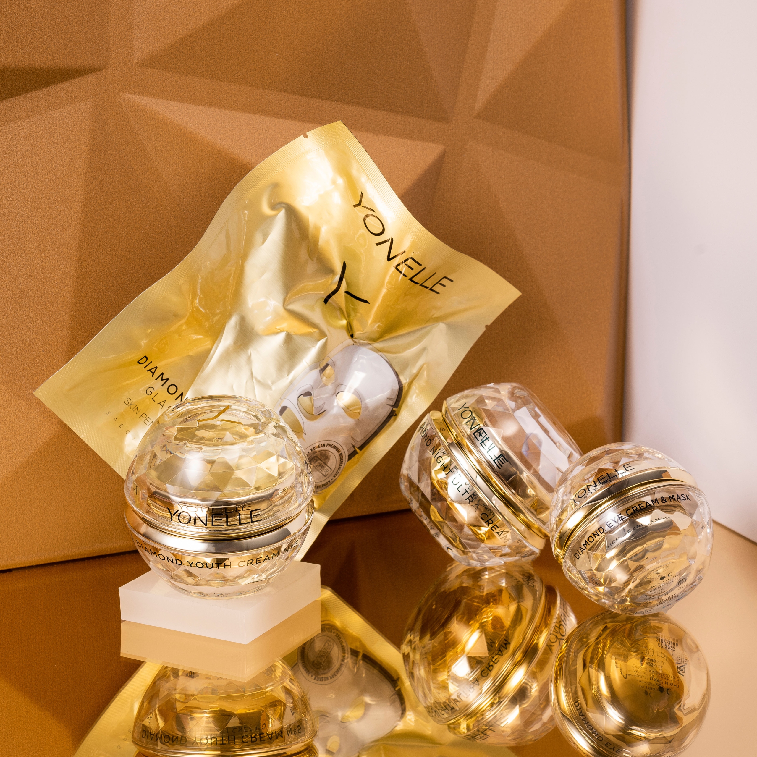 W serii DIAMOND zastosowano zaawansowany system nośników, składający się m.in. z NANODYSKÓW™ oraz cząsteczek diamentu, aktywnie „wtłaczających” w skórę substancję chroniącą kolagen. Działanie odmładzające zapewniają 4 peptydy oraz 4 silne antyoksydanty.