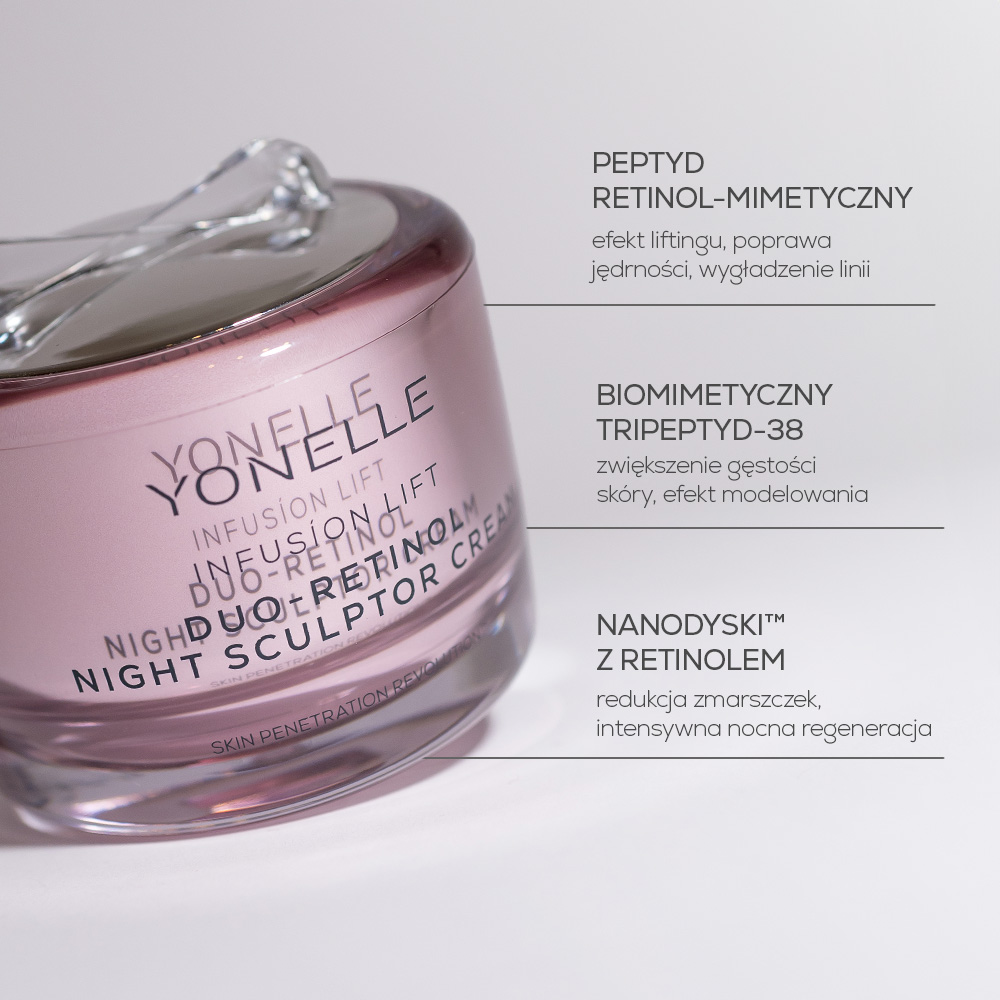 • NANODYSKI™ z retinolem: stabilna, wysoko biodostępna forma witaminy A. Wygładza zmarszczki, poprawia koloryt i elastyczność skóry, potęgując nocną regenerację oraz działanie liftingujące.