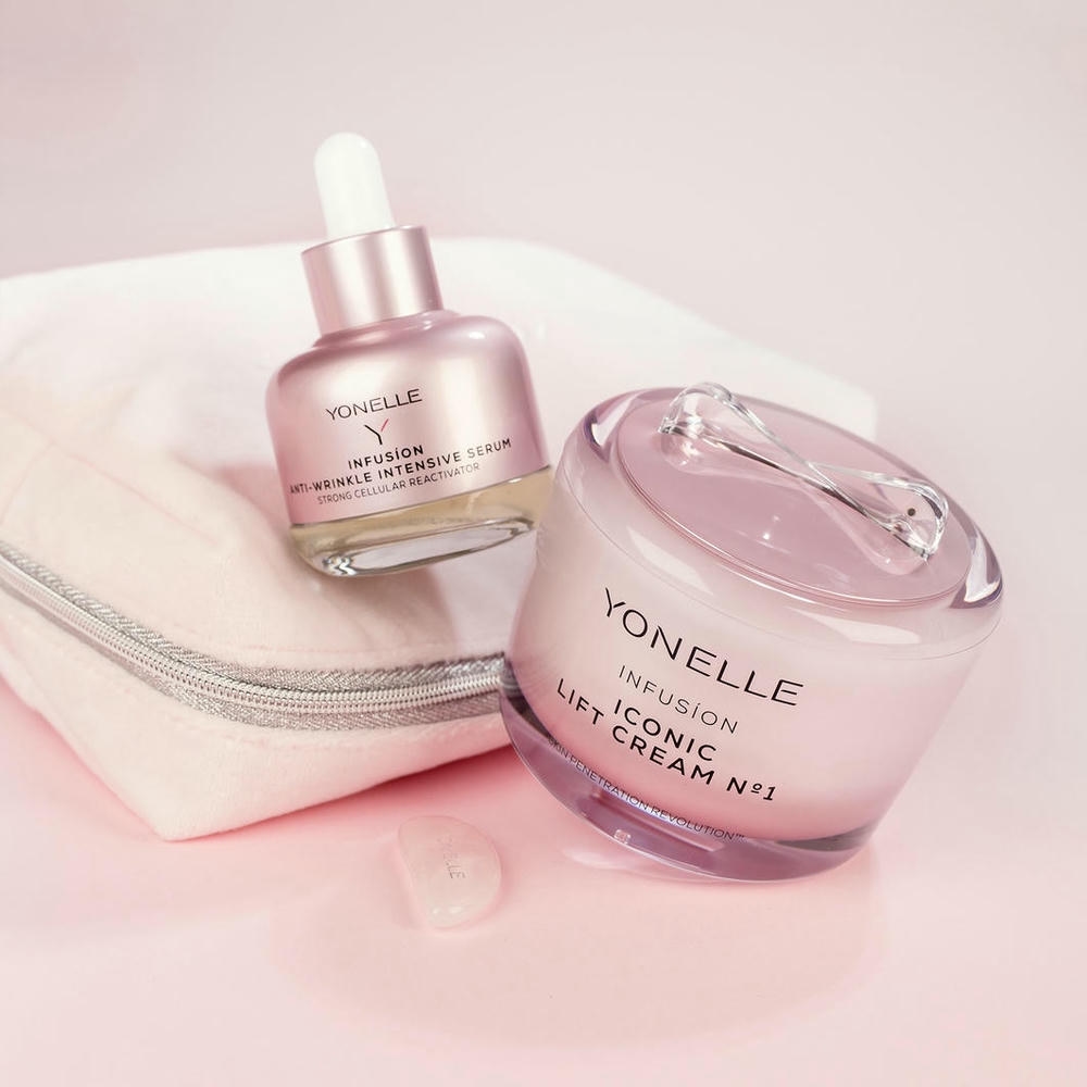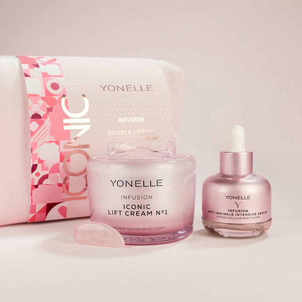 Limitowany zestaw Podwójnie Liftingujący „Zastrzyk Młodości” stworzony z myślą o każdym typie skóry dojrzałej oraz z pierwszymi oznakami starzenia, która oczekuje wyraźniej poprawy napięcia i widocznego wygładzenia. W eleganckiej kosmetyczce znajdują się dwa bestsellerowe kosmetyki INFUSION: krem N°1 oraz intensywne serum. Zestaw uzupełnia Różowy Jadeit YONELLE, który wspiera aktywację skóry i wzmacnia efekt pielęgnacji. Połączenie technologii NANODYSKÓW™ z masażem potęguje efekt i tworzy luksusową podwójnie liftingującą terapię – idealną na prezent oraz jako element świadomej, codziennej pielęgnacji.